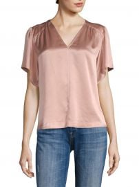 Grace Adler (played by Debra Messing) on Will and Grace on NBC was spotted wearing this beige silk v-neck top on Will and Grace on episode 'Where in the World Is Karen Walker?' (10x02) in Oct 2018. Grace's Top is the Flutter-Sleeve Charmeuse Blouse by Rebecca Taylor.