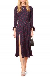 Kelly Ripa on Live with Kelly and Mark on Disney ABC Home Entertainment was spotted wearing this navy floral slit midi dress on Live with Kelly and Ryan on Aug 26 2019's episode. Kelly's Dress is the Zelda Dress by Reformation.