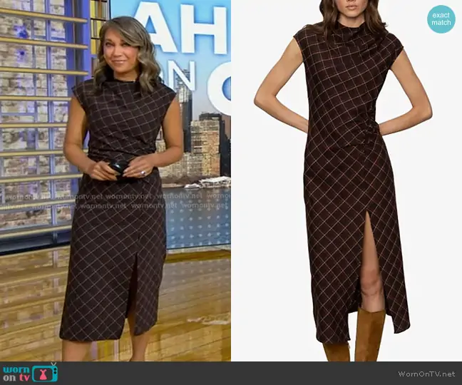 Cecilia Vega on Good Morning America on ABC was spotted wearing this geometric print midi dress on Good Morning America on May 30 2019's episode. Cecilia's Dress is the Geo Squares Midi Dress by Kate Spade.