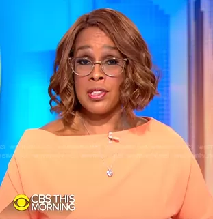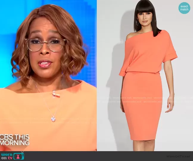 Gayle King on CBS Mornings on CBS was spotted wearing this orange off shoulder dress on CBS This Morning on Sep 25 2020's episode. Gayle's Dress is the Off-Shoulder Sheath Dress - Gabrielle Union Collection by New York & Company.