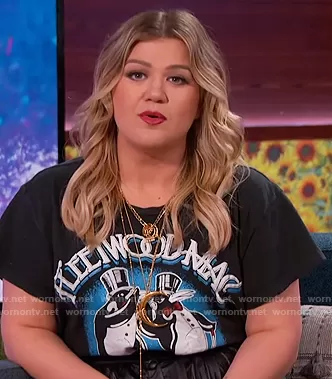 Kelly Clarkson on The Kelly Clarkson Show on NBC was spotted wearing this black Fleetwood Mac graphic tee on The Kelly Clarkson Show on Sep 25 2020's episode. Kelly's Top is the Fleetwood Mac American Tour '77 Tee by Madeworn.