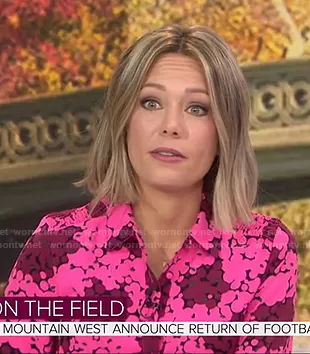 Dylan Dreyer on Today on NBC was spotted wearing this pink floral shirtdress on Today on Sep 25 2020's episode. Dylan's Dress is the Floral Flare Shirtdress by Kate Spade.