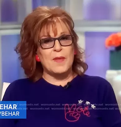 Joy Behar on The View on ABC was spotted wearing this blue Vote sweater on The View on Sep 28 2020's episode. Joy's Sweater is the Vote Sweater by Lingua Franca.