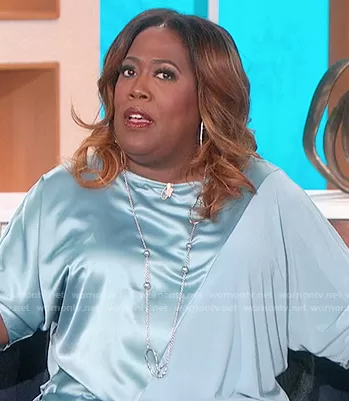 Sheryl Underwood on The Talk on CBS was spotted wearing this blue mixed satin top on The Talk on Sep 28 2020's episode. Sheryl's Top is the Mixed-Media Colorblocked Top by Alfani.