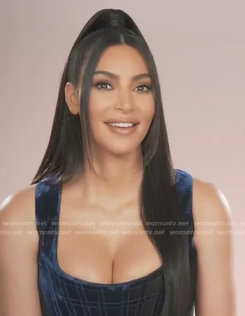 Kim Kardashian on Keeping Up with the Kardashians on E! was spotted wearing this blue velvet corset top on Keeping Up with the Kardashians on episode 'Paris, Puppies and Pranks' (19x02) in Sep 2020. Kim's Top is the Velvet Corset by Vivienne Westwood.