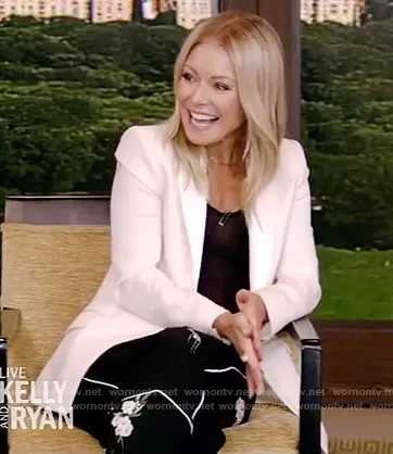 Kelly Ripa on Live with Kelly and Mark on Disney ABC Home Entertainment was spotted wearing this black floral piping trim pants on Live with Kelly and Ryan on Sep 30 2020's episode. Kelly's Pants is the Floral Print Cropped Trousers by No. 21.