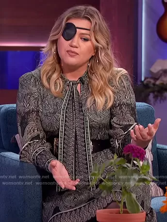 Tanisha Paisley Tie Neck Long Sleeve Dress by Alice + Olivia worn by Kelly Clarkson on The Kelly Clarkson Show