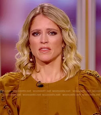 Sara Haines on The View on ABC was spotted wearing this mustard denim eyelet top on The View on Oct 01 2020's episode. Sara's Top is the Rue Embroidered Denim Short Sleeve Top by Sea.