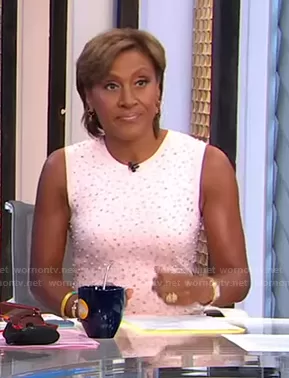 Robin Roberts on Good Morning America on ABC was spotted wearing this pink embellished sleeveless dress on Good Morning America on Oct 01 2020's episode. Robin's Dress is the Embroidered Stretch-Viscose Trumpet Dress by Michael Kors.