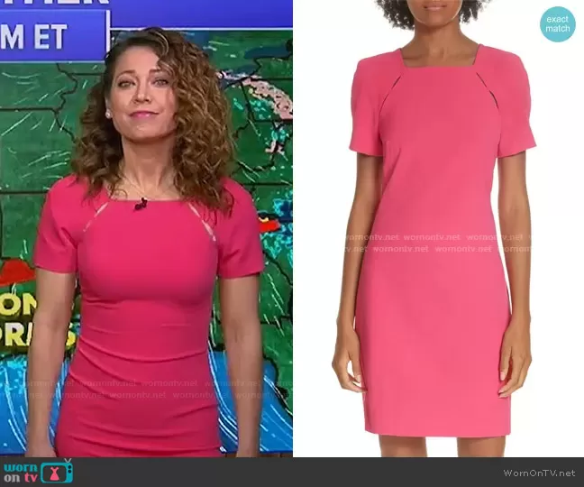 Ginger Zee on Good Morning America on ABC was spotted wearing this pink cutout short sleeve dress on Good Morning America on Mar 16 2021's episode. Ginger's Dress is the Kristiana Cutout Detail Sheath Dress by Alice + Olivia.