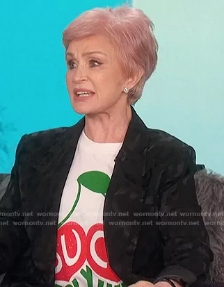 Sharon Osbourne on The Talk on CBS was spotted wearing this white gucci tee and blazer on The Talk on Oct 01 2020's episode. Sharon's Top is the Beverly Hills cherry-print T-shirt by Gucci . Sharon's Blazer is the Tate Jacquard Blazer by Anine Bing.