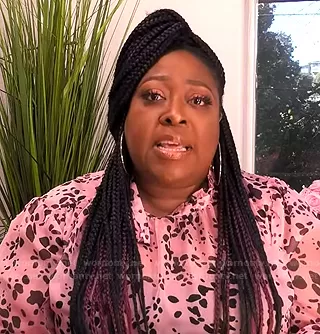 Loni Love on The Real on BETher was spotted wearing this pink dotted ruffle blouse on The Real on Oct 01 2020's episode. Loni's Top is the Printed Sheer Ruffle Neck Blouse by Eloquii.
