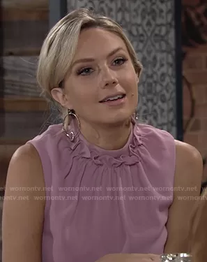 Abby Newman (played by Melissa Ordway) on The Young and the Restless on CBS was spotted wearing this pink ruffle neck sleeveless top on The Young and the Restless on Sep 30 2020's episode. Abby's Top is the Audrye top by Ted Baker.