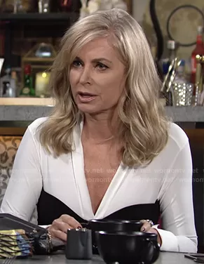 Ashley Abbott (played by Eileen Davidson) on The Young and the Restless on CBS was spotted wearing this black and white long sleeved dress on The Young and the Restless on Oct 02 2020's episode. Ashley's Dress is the Austina Dress by Chiara Boni La Petite Robe.