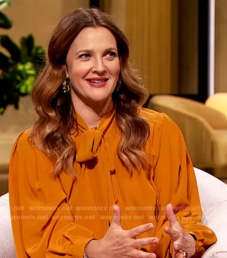 Drew Barrymore on The Drew Barrymore Show on CBS was spotted wearing this orange tie neck blouse on The Drew Barrymore Show on Oct 06 2020's episode. Drew's Top is the Pussy-bow silk crepe de chine blouse by Victoria Beckham . Drew's Shoes is the Bianca knotted suede platform sandals by Saint Laurent.