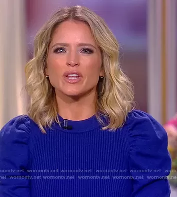 Sara Haines on The View on ABC was spotted wearing this blue short puff sleeve top on The View on Oct 07 2020's episode. Sara's Top is the Puff Sleeve Sweater Top by En Saison.