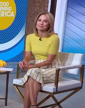 Amy Robach on Good Morning America on ABC was spotted wearing this yellow short sleeve sweater and check tweed skirt on Good Morning America on Oct 07 2020's episode. Amy's Sweater is the Short Sleeve Cashmere Blend Top by Vince . Amy's Skirt is the Plaid Tweed Pencil Skirt by Halogen.