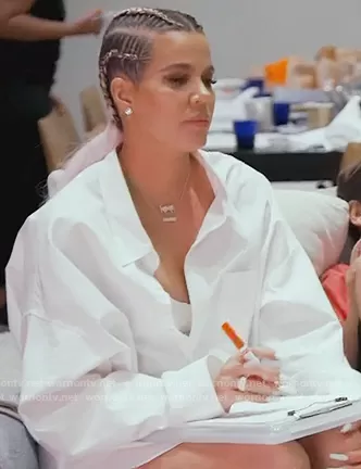Khloe Kardashian on Keeping Up with the Kardashians on E! was spotted wearing this white oversized shirt on Keeping Up with the Kardashians on episode 'Trouble in Palm Springs' (19x04) in Oct 2020. Khloe's Top is the Oversized Poplin Shirt by R13 . Khloe's Shorts is the Bombshell Distressed Cutoff Denim Shorts by Good American . Khloe's Shoes is the B23 High Top Logo Oblique by Dior.