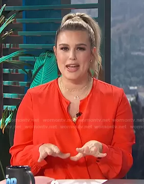 Carissa Loethen Culiner on E! News on E! was spotted wearing this red surplice blouse on E! News Daily Pop on Oct 09 2020's episode. Carissa's Top is the Lora Silk Surplice Blouse by Rag & Bone.