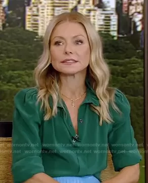 Kelly Ripa on Live with Kelly and Mark on Disney ABC Home Entertainment was spotted wearing this green blouse and blue pleated skirt on Live with Kelly and Ryan on Oct 09 2020's episode. Kelly's Top is the Lamia Ruffle-Trimmed Silk Blouse by Isabel Marant . Kelly's Skirt is the Pleated Faux Leather Skirt by Cédric Charlier . Kelly's Shoes is the Suede Pumps by by Gianvito Rossi.