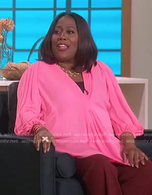 Sheryl Underwood on The Talk on CBS was spotted wearing this pink pleated top on The Talk on Oct 09 2020's episode. Sheryl's Top is the Jordana Silk Blouse by Kobi Halperin.