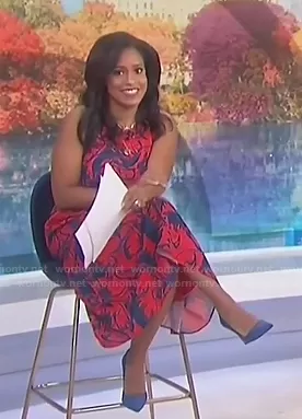 Sheinelle Jones on Today on NBC was spotted wearing this red floral sleeveless dress on Today on Oct 12 2020's episode. Sheinelle's Dress is the Floral Midi Dress by Slate & Willow.