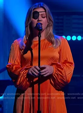Kelly Clarkson on The Kelly Clarkson Show on NBC was spotted wearing this orange pleated satin dress on The Kelly Clarkson Show on Oct 13 2020's episode. Kelly's Dress is the Behati Dress by A.L.C..
