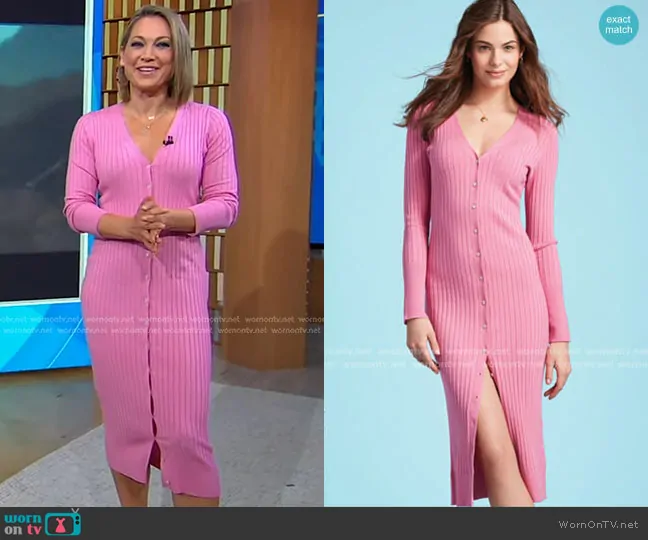 Ginger Zee on Good Morning America on ABC was spotted wearing this pink ribbed knit dress on Good Morning America on Jan 29 2025's episode. Ginger's Sweater is the Wide Rib Duster Cardigan by 525 America.