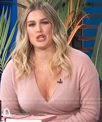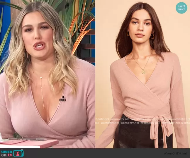 Carissa Loethen Culiner on E! News on E! was spotted wearing this pink knit wrap top on E! News Daily Pop on Oct 13 2020's episode. Carissa's Top is the Relaxed Cashmere Wrap by Reformation.