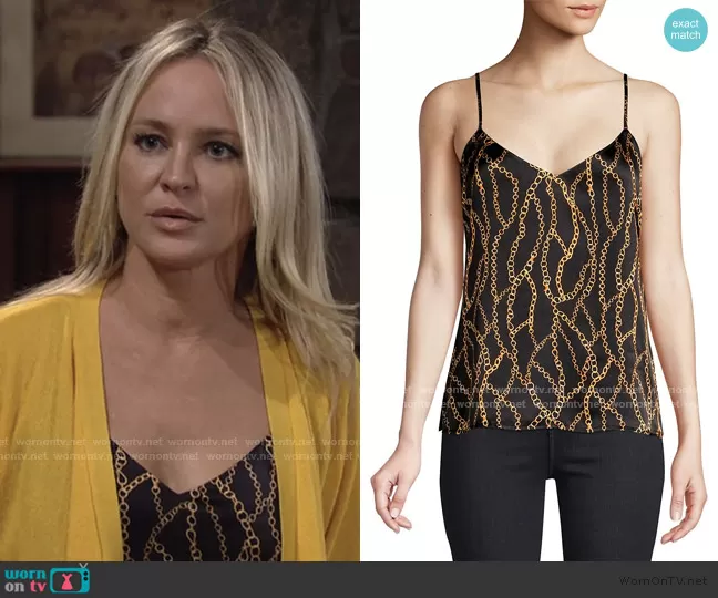 Sharon Newman (played by Sharon Case) on The Young and the Restless on CBS was spotted wearing this black chain print cami and yellow cardigan on The Young and the Restless on Oct 13 2020's episode. Sharon's Camisole is the Jane Chain Print Top by L'Agence.