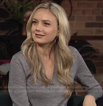 Abby Newman (played by Melissa Ordway) on The Young and the Restless on CBS was spotted wearing this grey v-neck sweater on The Young and the Restless on Oct 13 2020's episode. Abby's Sweater is the Tatiana Layered Merino Wool Blend Sweater by Veronica Beard.