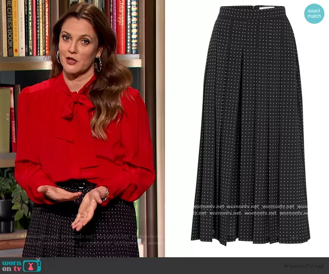 Drew Barrymore on The Drew Barrymore Show on CBS was spotted wearing this black polka dot skirt on The Drew Barrymore Show on Oct 14 2020's episode. Drew's Skirt is the Polka-dots skirt by Max Mara . Drew's Earrings is the Eight Nano Hoop Earrings by Paco Rabanne.