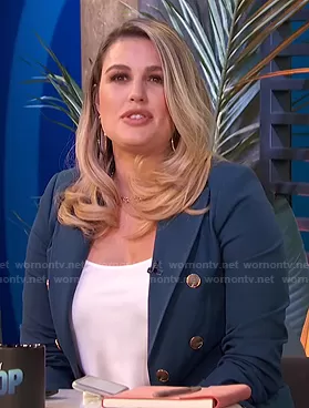 Carissa Loethen Culiner on E! News on E! was spotted wearing this blue double breasted blazer and pants on E! News Daily Pop on Oct 14 2020's episode. Carissa's Jacket is the Eliza Double-Breasted Jacket by Derek Lam 10 Crosby . Carissa's Pants is the Adeline Cropped Flare Trousers by Derek Lam 10 Crosby.