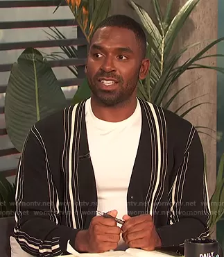 Justin Sylvester on E! News on E! was spotted wearing this black striped cardigan on E! News Daily Pop on Oct 14 2020's episode. Justin's Sweater is the Cotton Blend Striped Cardigan by The Kooples.