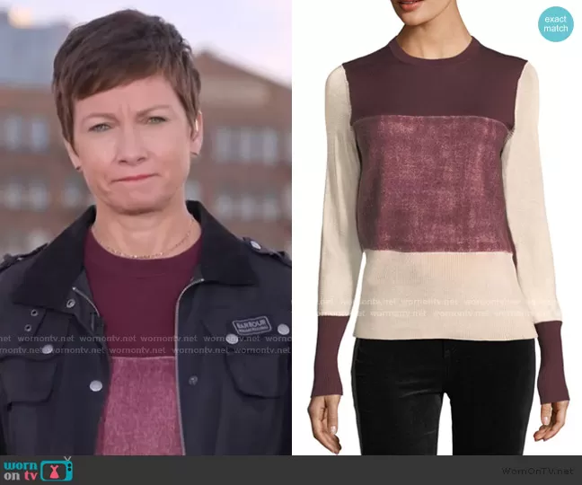 Stephanie Gosk on Today on NBC was spotted wearing this burgundy colorblock sweater on Today on Oct 15 2020's episode. Stephanie's Sweater is the Marissa Sweater by Rag & Bone.
