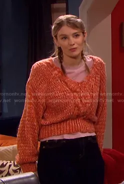 Alice Caroline Horton (played by Lindsay Arnold) on Days of our Lives on Peacock was spotted wearing this orange chunky knit v-neck sweater on Days of our Lives on Oct 16 2020's episode. Allie's Sweater is the Central Cable Sweater by Topshop.