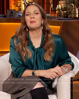 Drew Barrymore on The Drew Barrymore Show on CBS was spotted wearing this teal satin tie blouse and pants on The Drew Barrymore Show on Oct 16 2020's episode. Drew's Top is the Scarf-Neck Satin Blouse by Tom Ford . Drew's Pants is the Culottes in Prince of Wales by Celine . Drew's Belt is the Horsebit leather belt by Gucci.