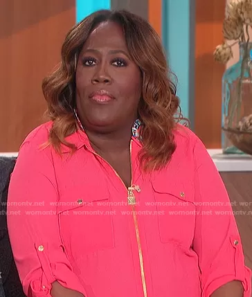 Sheryl Underwood on The Talk on CBS was spotted wearing this pink lock zip blouse on The Talk on Oct 16 2020's episode. Sheryl's Top is the Plus Size Zip-Front Utility Shirt by Michael Kors.
