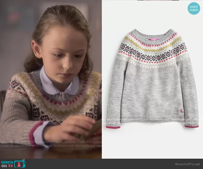 Flora Wingrave (played by Amelie Bea Smith) on The Haunting of Bly Manor on Netflix was spotted wearing this fair isle print sweater on The Haunting of Bly Manor on episode 'The Two Faces, Part One' (1x03) in Oct 2020. Flora's Sweater is the Orkney Fair Isle Jumper by Joules.
