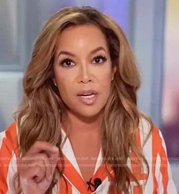 Sunny Hostin on The View on ABC was spotted wearing this orange stripe blouse on The View on Oct 15 2020's episode. Sunny's Top is the Chateau Silk Long Sleeve Shirt by Aliette.