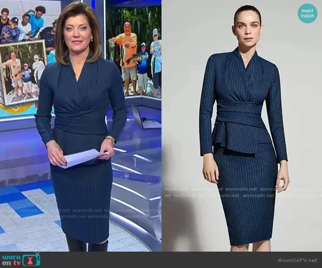 Norah O'Donnell on CBS Evening News on CBS was spotted wearing this blue herringbone wrap top and skirt on CBS Evening News on Nov 20 2024's episode. Norah's Top is the Belleville Top by The Fold London . Norah's Skirt is the Hartley Skirt by The Fold London.