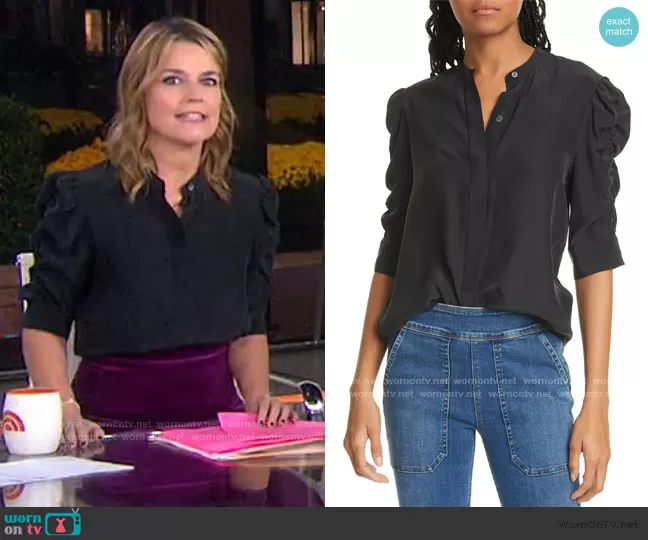 Savannah Guthrie on Today on NBC was spotted wearing this black blouse and purple velvet skirt on Today on Oct 21 2020's episode. Savannah's Top is the Shirred Sleeve Silk Blouse by Frame . Savannah's Skirt is the Alma Cotton-Velvet Midi Skirt by ARoss Girl x Soler.