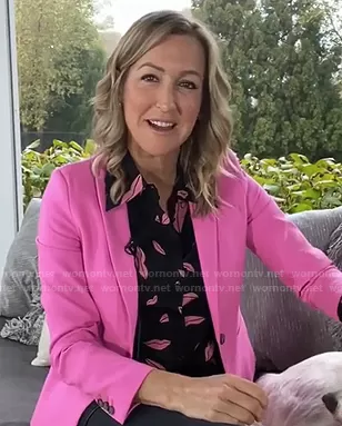Lara Spencer on Good Morning America on ABC was spotted wearing this black and pink lip print blouse on Good Morning America on Oct 21 2020's episode. Lara's Top is the Falling Lips Print Shirt by Diane von Furstenberg.