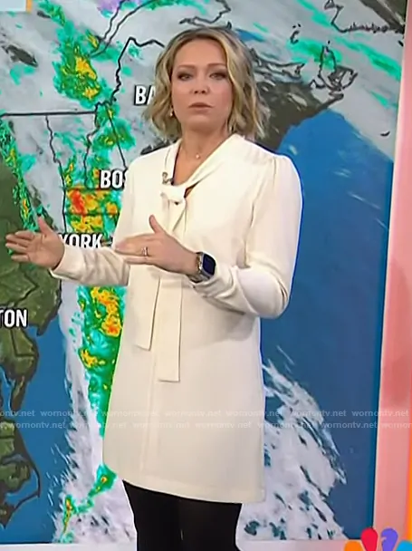 Dylan Dreyer on Today on NBC was spotted wearing this white tie neck dress on Today on Dec 30 2024's episode. Dylan's Dress is the Ines Tie Neck Long Sleeve Shift Dress by Gal Meets Glam.