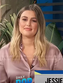 Carissa Loethen Culiner on E! News on E! was spotted wearing this pink satin silk blouse on E! News Daily Pop on Oct 22 2020's episode. Carissa's Top is the Shaped Collar Silk Blouse by Vince.