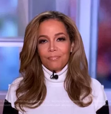 Sunny Hostin on The View on ABC was spotted wearing this white colorblock sweater on The View on Oct 22 2020's episode. Sunny's Sweater is the Colorblock Merino Wool Turtleneck Sweater by Eileen Fisher.