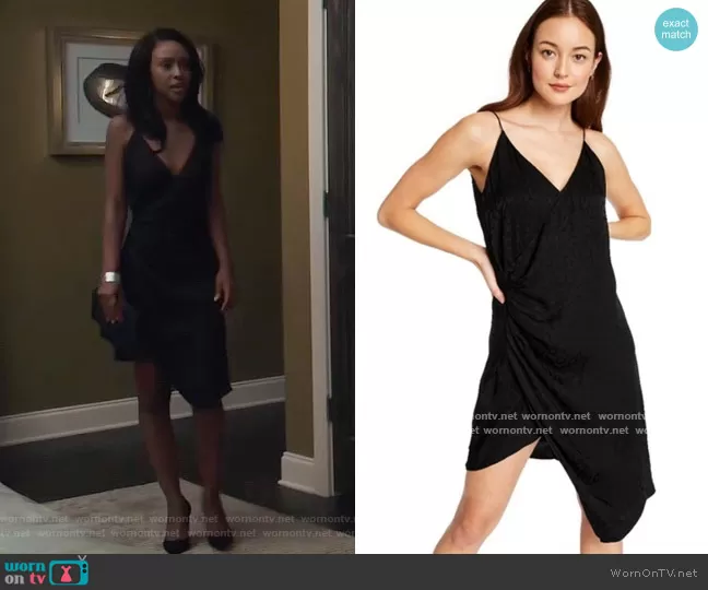 Karen Mott (played by Ebony Obsidian) on Tyler Perrys Sistas on BET was spotted wearing this black asymmetric slip dress on Tyler Perrys Sistas on episode 'It's All About Pacing' (2x03) in Oct 2020. Karen's Dress is the Leopard Wrap Dress by Cushnie x Target.