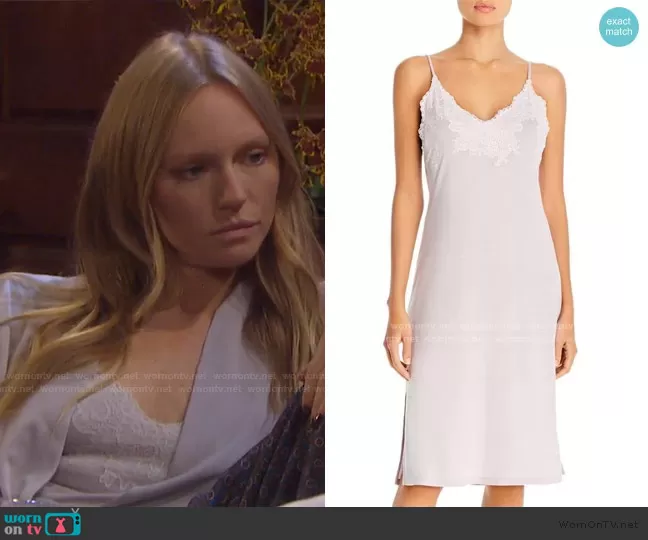 Abigail Deveraux (played by Marci Miller) on Days of our Lives on Peacock was spotted wearing this lilac lace trim chemise and robe on Days of our Lives on Oct 23 2020's episode. Abigail's Chemise is the Luxe Shangri-La Chemise by Natori . Abigail's Robe is the Luxe Shangri-La Robe by Natori.