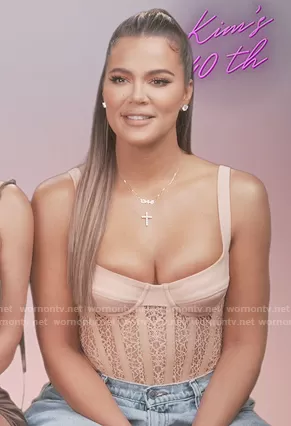 Khloe Kardashian on Keeping Up with the Kardashians on E! was spotted wearing this beige lace trim corset on Keeping Up with the Kardashians on episode 'Celebration Continues: Happy 40th Birthday, Kim!' (19x06) in Oct 2020. Khloe's Top is the contour combo corset by Dion Lee.