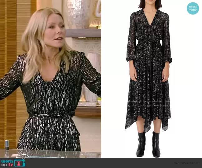 Kelly Ripa on Live with Kelly and Mark on Disney ABC Home Entertainment was spotted wearing this metallic v-neck tie waist dress on Live with Kelly and Ryan on Oct 23 2020's episode. Kelly's Dress is the Route Rimix Metallic Scarf Hem Midi Dress by Maje . Kelly's Shoes is the Ellipsis Pointed Pumps by Gianvito Rossi.